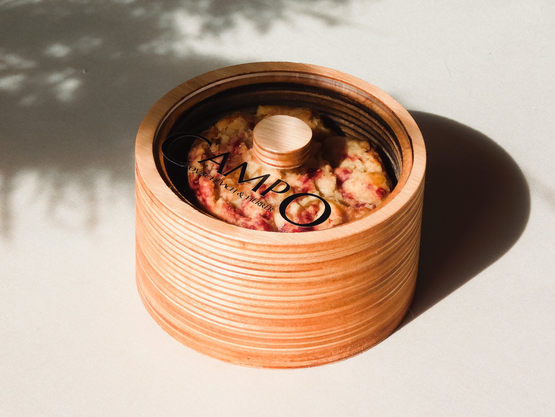 Una caja circular de madera con tapa de acrílico, elegante y natural, que guarda en su interior 3 irresistibles cookies estilo NY.