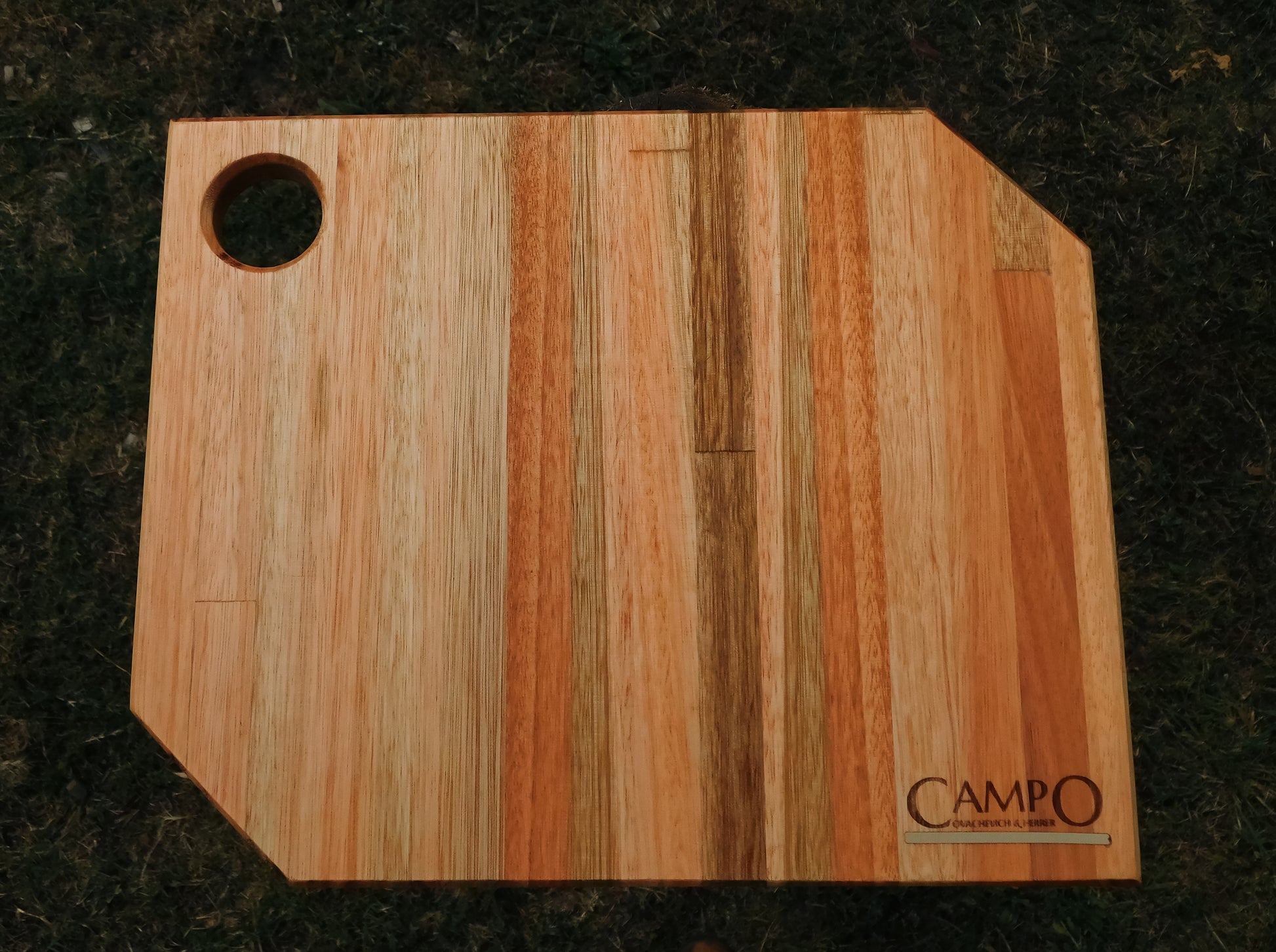 Tabla elaborada en Eucalipto macizo con un diseño ergonómico y detalle en bronce.